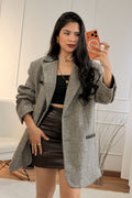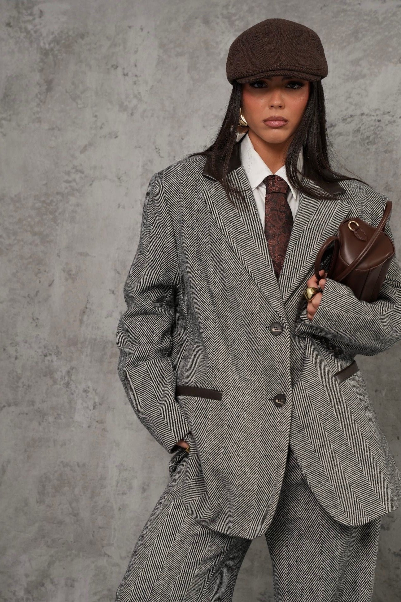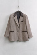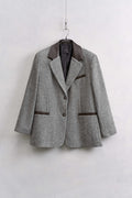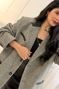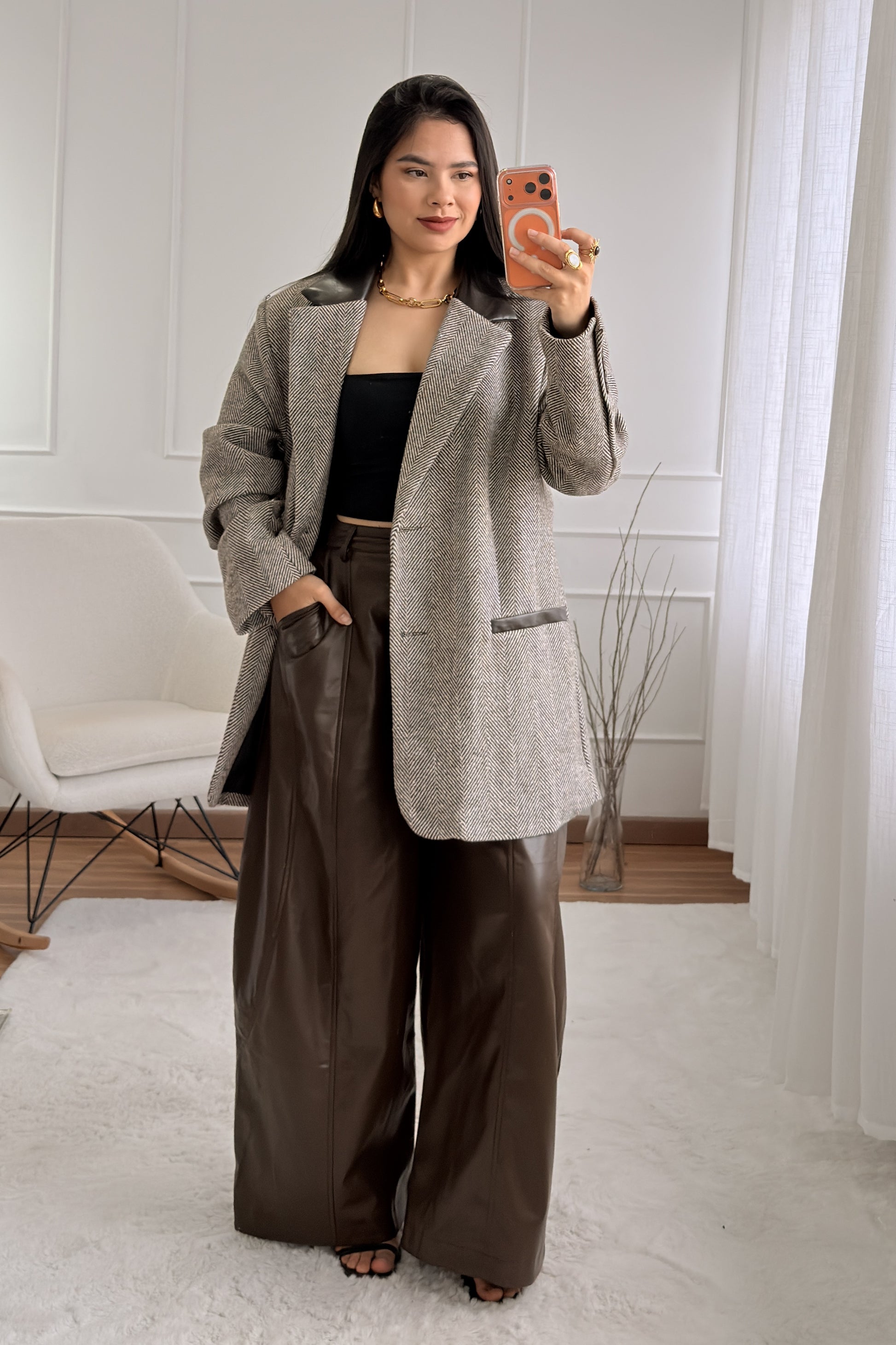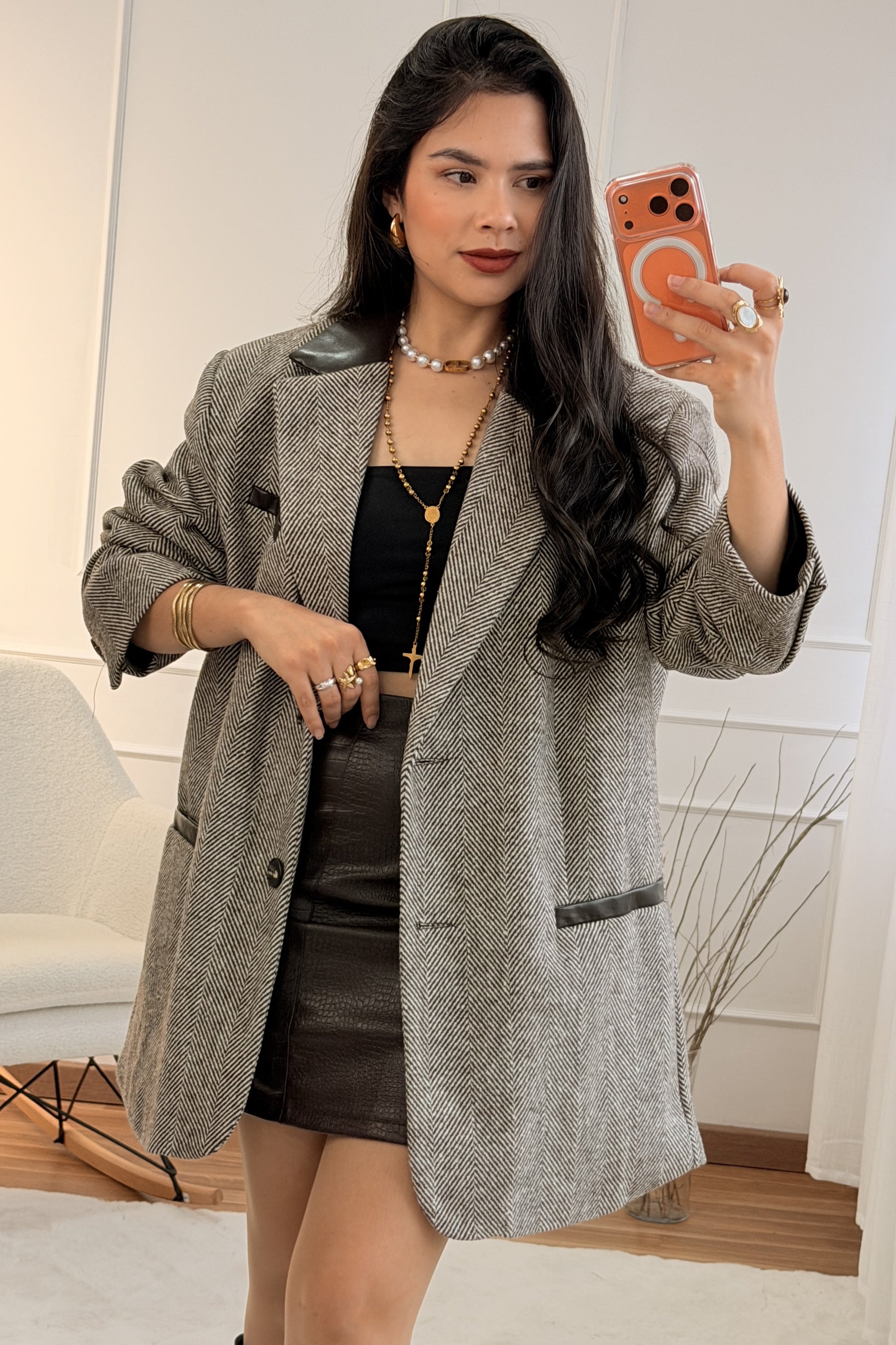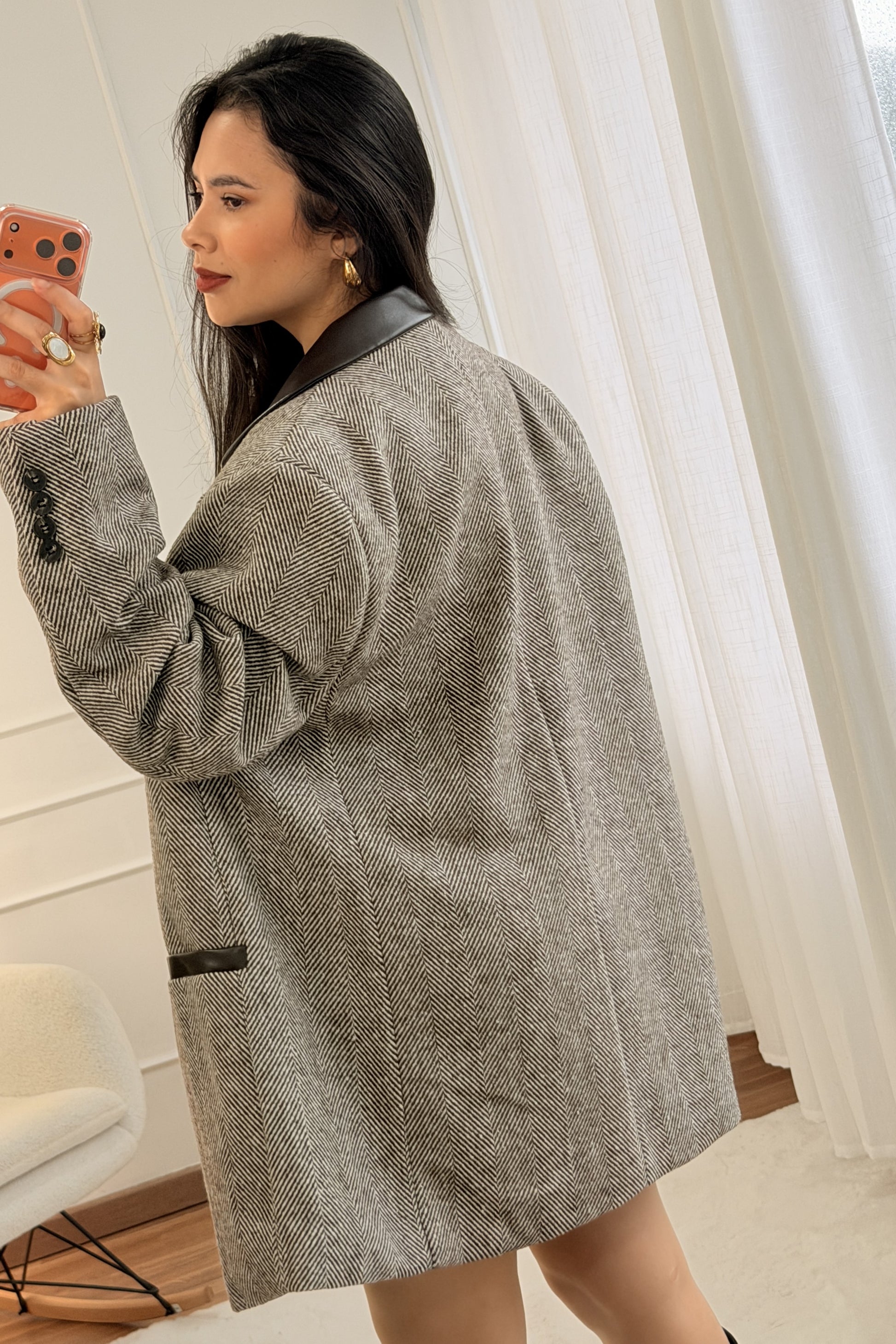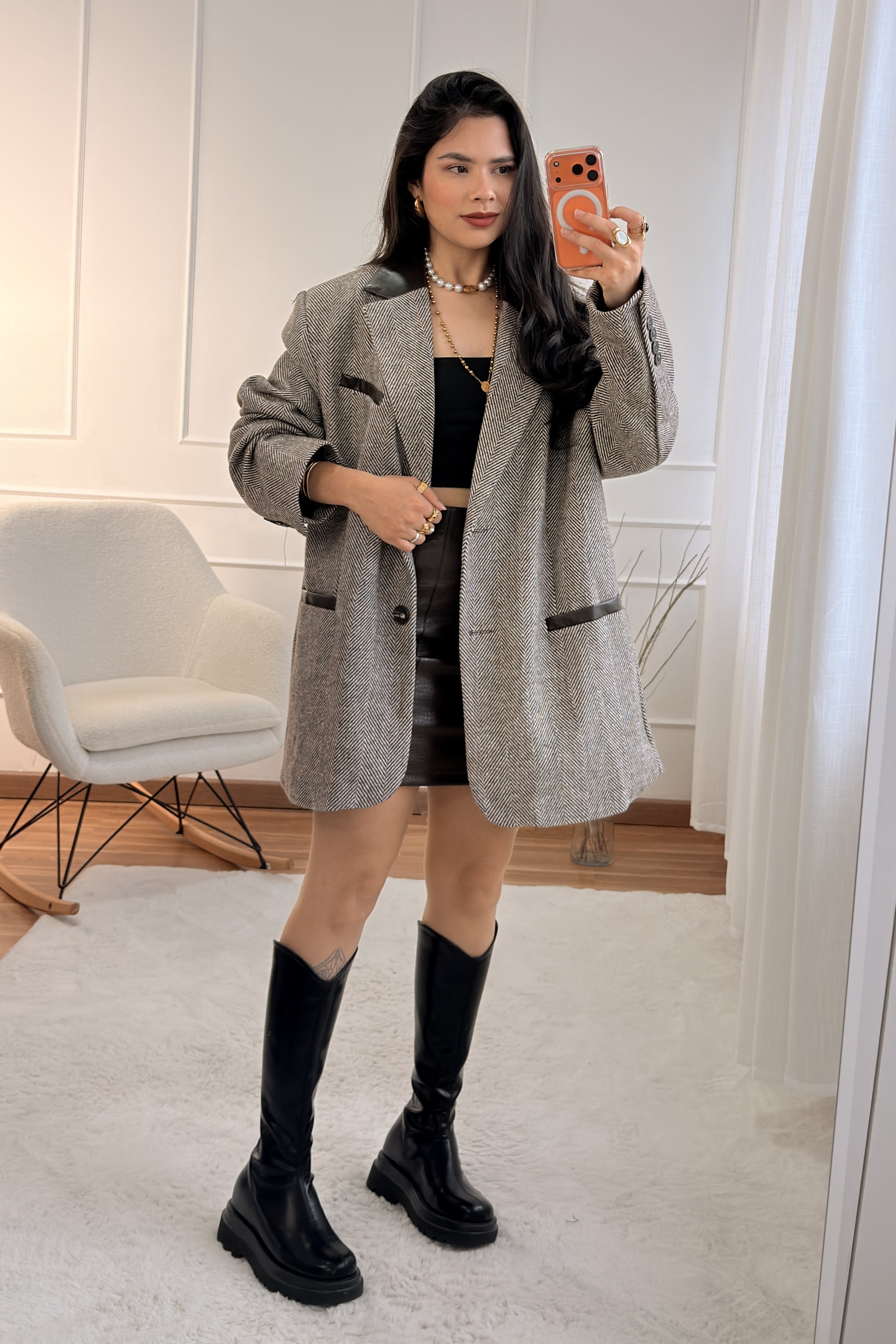 Blazer com gola de lapela. Detalhes em pele sintética. Fecho frontal com botões. Corte regular, disponível em tamanho único.