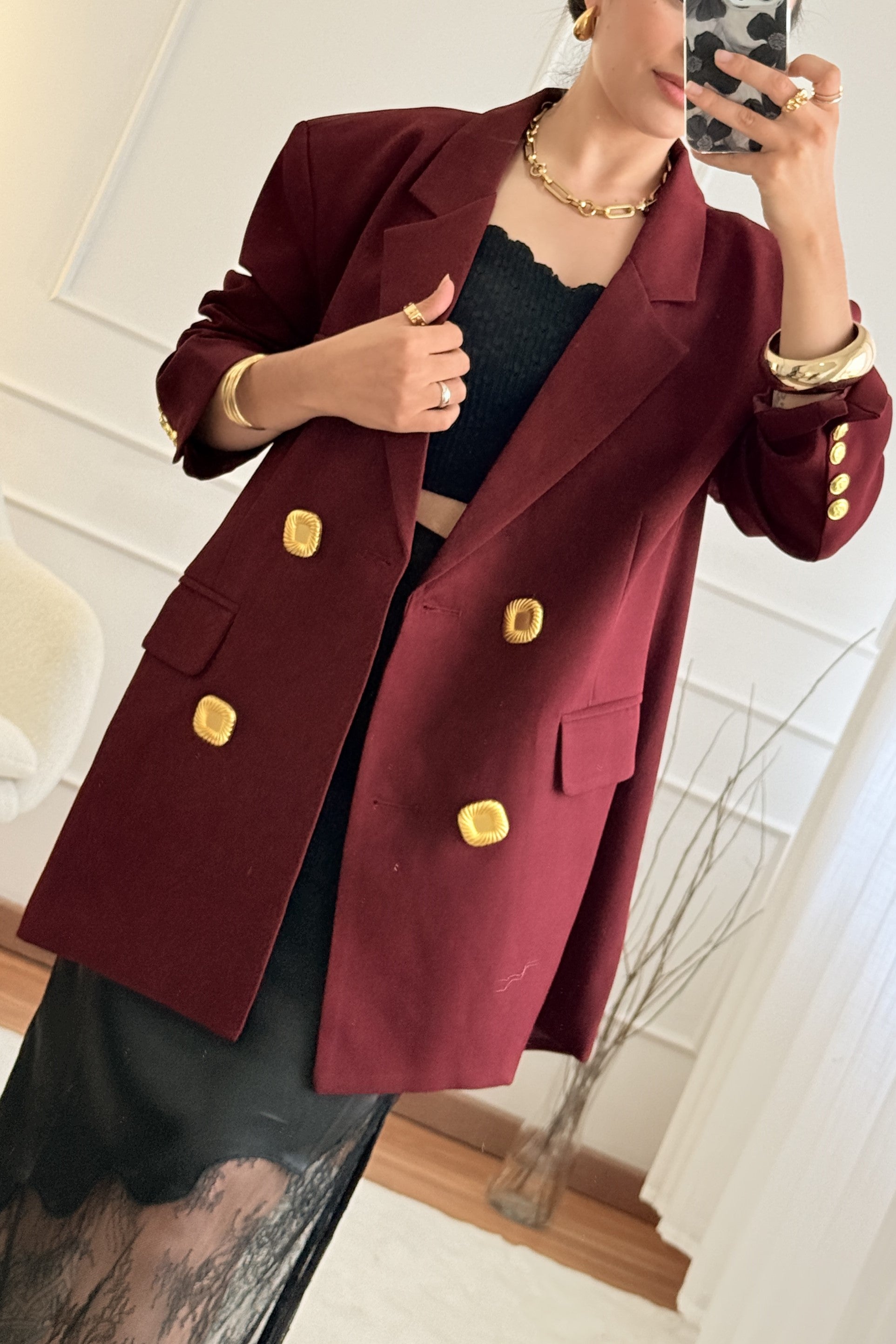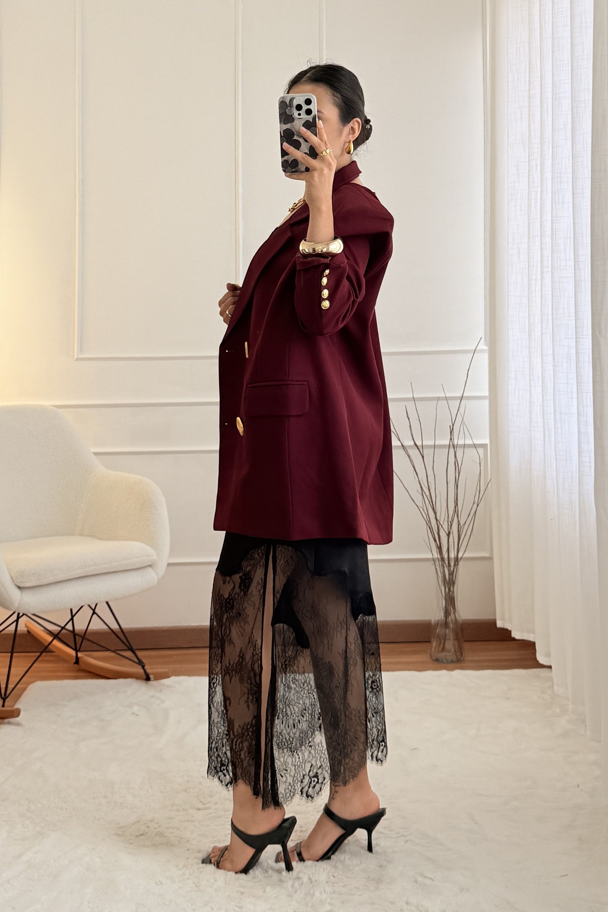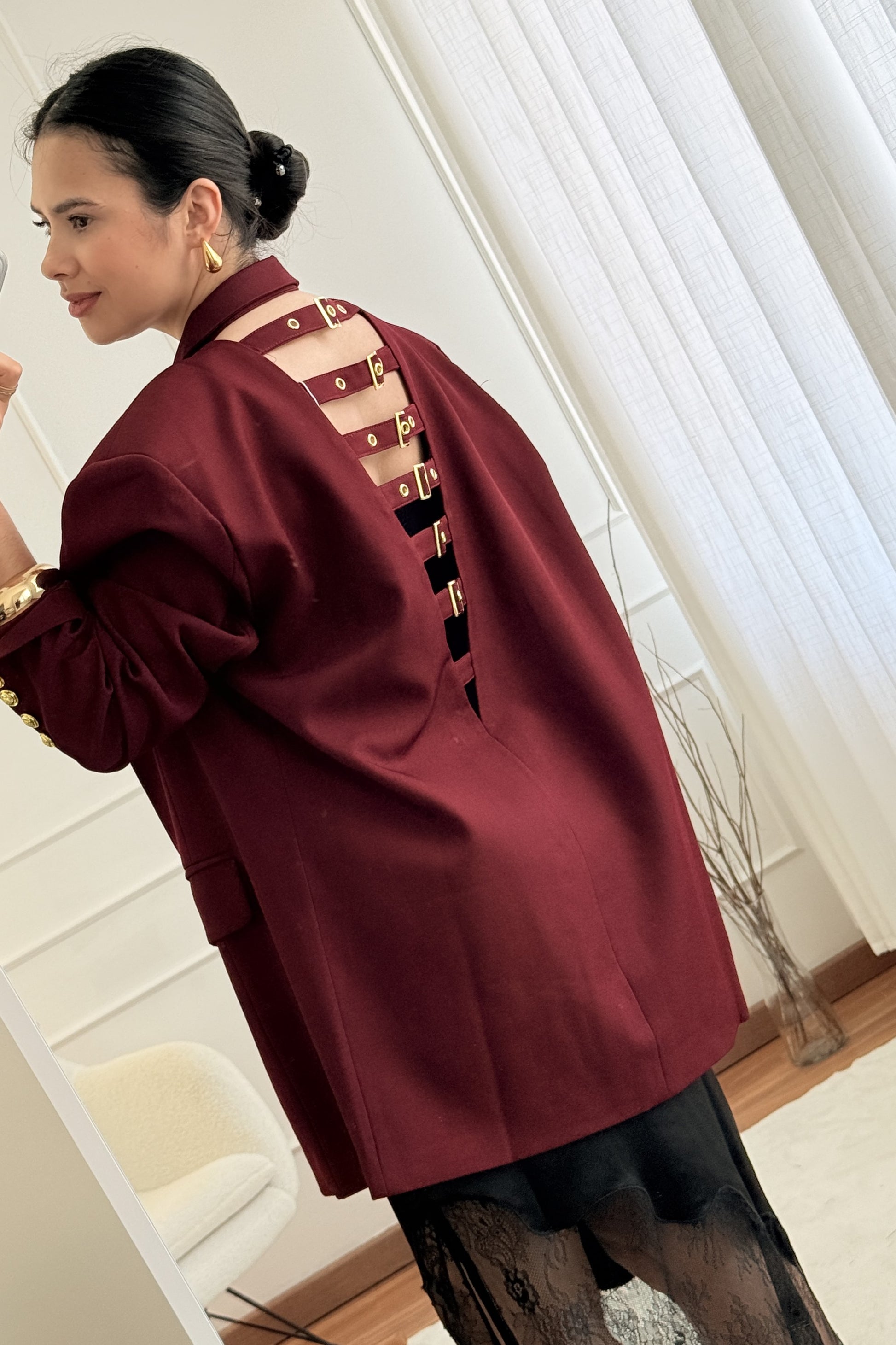 O casaco de fato tem um design de decote em V na parte de trás, com várias tiras de cinto que criam um efeito vazado. Possui ombreiras e um corte mais amplo, oferecendo um estilo elegante e confortável.