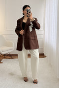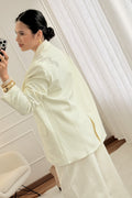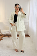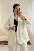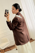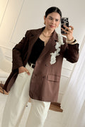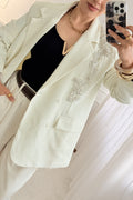 Blazer em corte oversize, confeccionado em tecido misto de algodão e poliéster. Apresenta gola de lapela clássica, fecho frontal com botões e bolsos laterais com pala. O destaque fica por conta da aplicação bordada com pedraria na parte frontal, que acrescenta sofisticação e originalidade à peça.