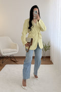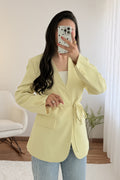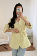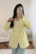Blazer sem gola, acompanhado de um cinto de cordão que pode ser amarrado na cintura para acentuar a silhueta.