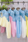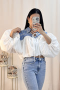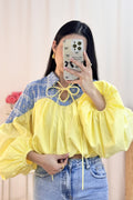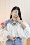 Esta blusa apresenta um design único, com mangas balão e uma barra de corpo também com efeito balão, ambos criados através de um corte em camadas. A união das diferentes partes forma um efeito de sobreposição, conferindo-lhe um toque de modernidade e sofisticação.