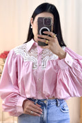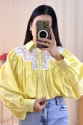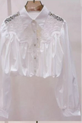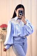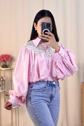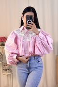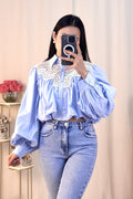 Uma blusa curta com parte superior em renda e parte inferior com design de balão. As mangas também têm um design longo em formato de balão.