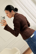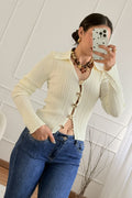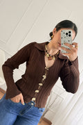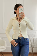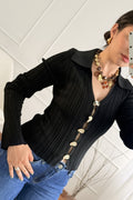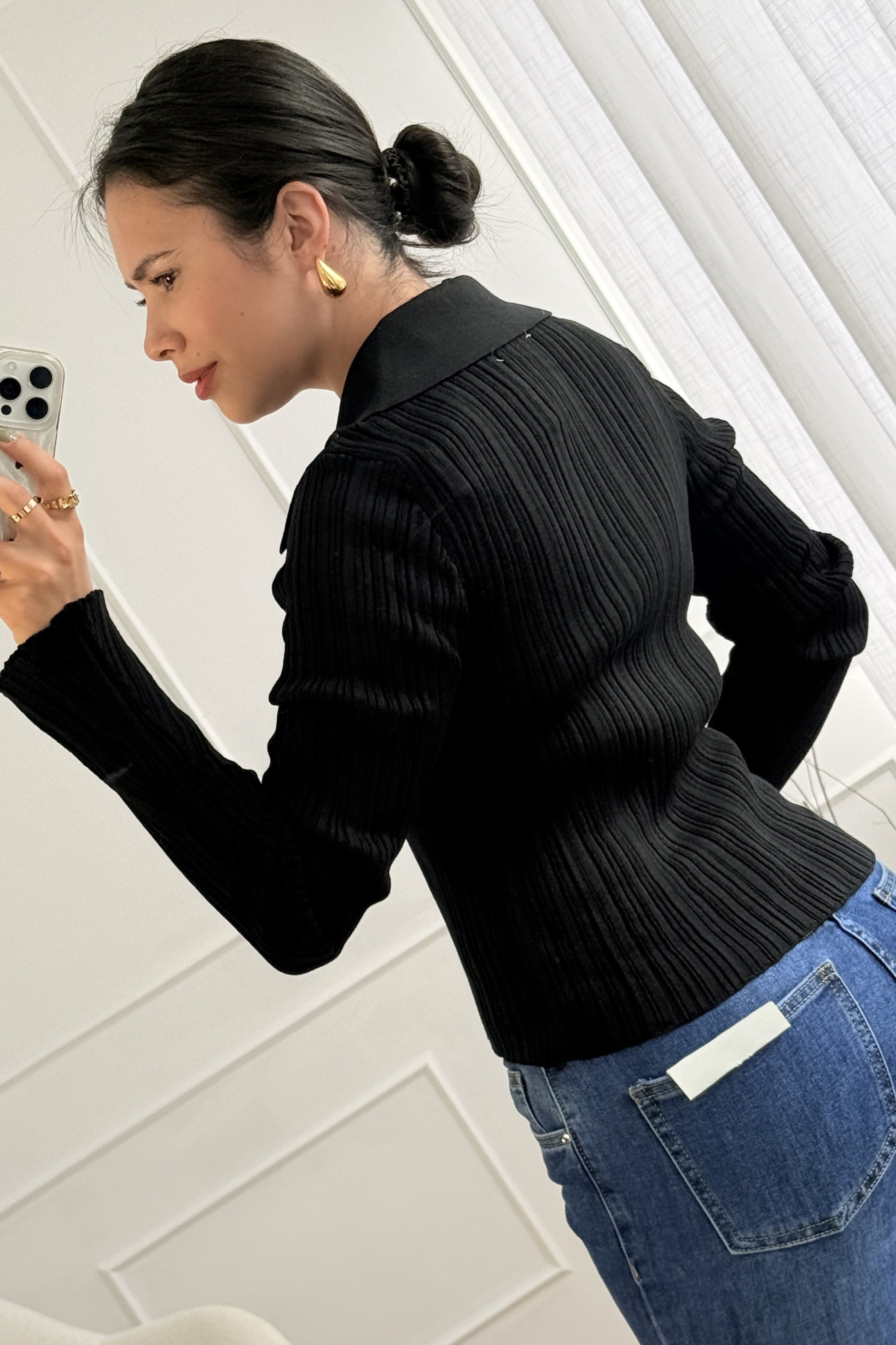 Blusa em malha canelada com gola clássica e fecho frontal de botões decorativos. Silhueta ajustada e confortável