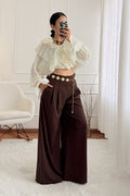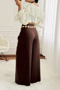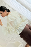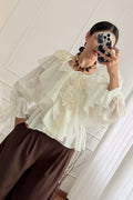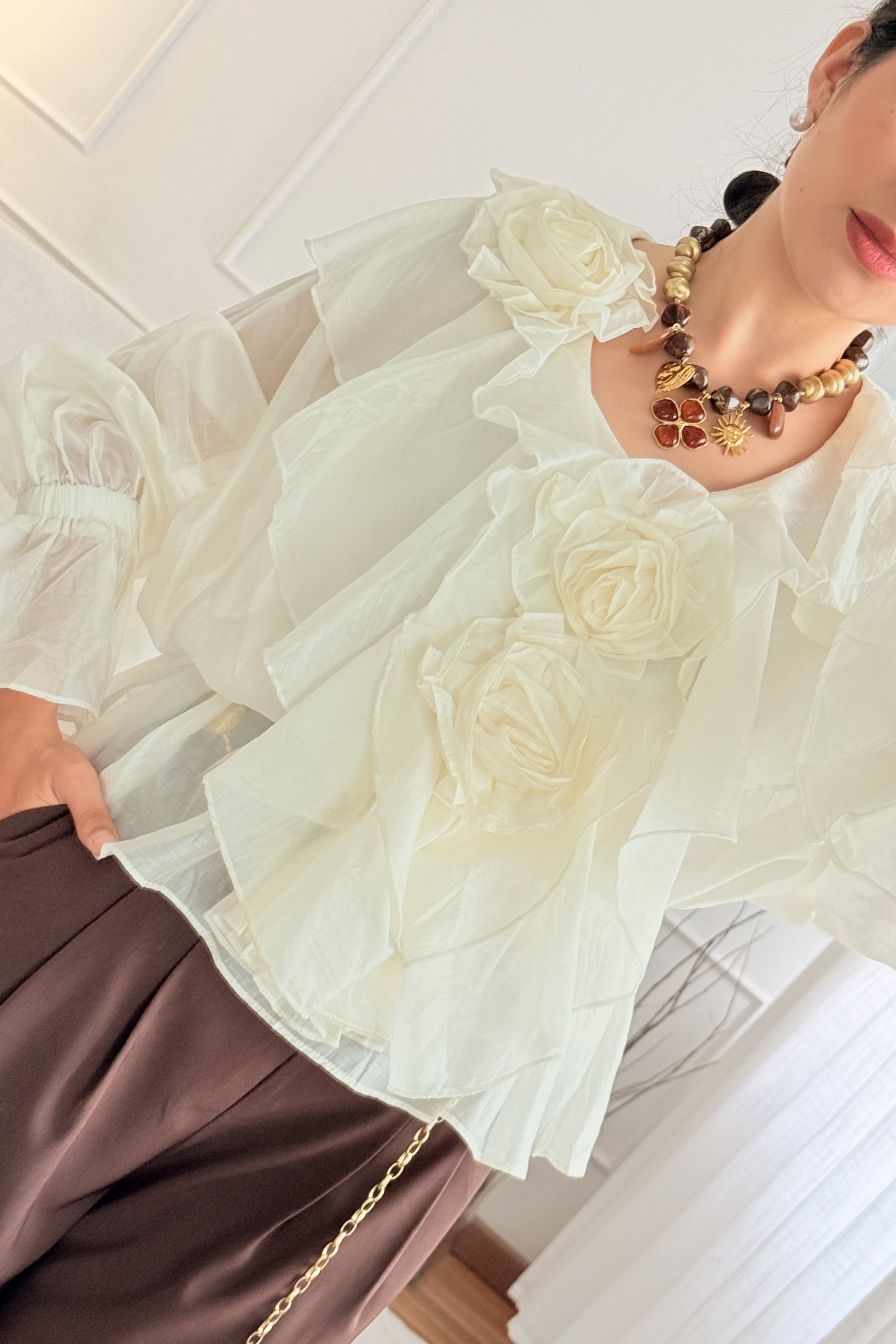 Blusa sofisticada confeccionada em seda com um toque de poliéster, que garante leveza e fluidez. O design destaca-se pelas aplicações florais em relevo e pelas mangas volumosas com acabamento franzido.