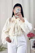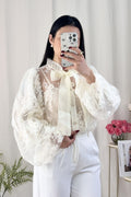 Blusa de organza com colarinho adornado com pérolas e diamantes de diferentes tamanhos. As mangas têm um design especial e vem acompanhada de um top.