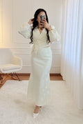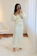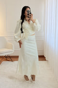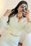 Blusa cruzada em tecido texturizado, com manga comprida volumosa e detalhe floral aplicado na cintura. Modelo elegante e sofisticado para ocasiões especiais.