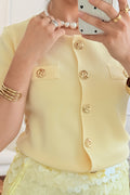 Blusa em malha macia, com corte elegante e detalhes refinados. Possui botões decorativos de inspiração clássica e bolsos falsos na parte frontal, conferindo sofisticação e um toque vintage. O design versátil combina facilmente com saias, calças ou calções,