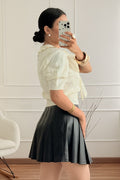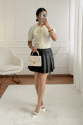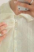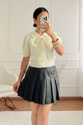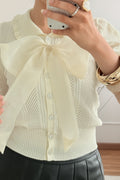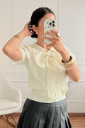 Blusa de malha com manga curta e design delicado, perfeita para um visual feminino e romântico. Apresenta gola redonda, botões decorativos na parte frontal e detalhe de laço aplicado no peito, totalmente removível, permitindo criar diferentes estilos. Confeção em malha de alta qualidade