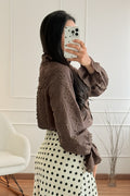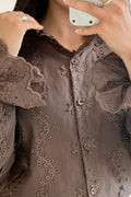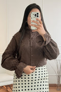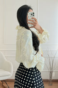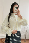 Blusa feminina de estilo romântico com detalhes bordados delicados e mangas bufantes. O design rendado oferece um toque elegante e clássico, ideal para compor looks sofisticados ou dar um charme especial ao dia a dia. Fecho frontal com botões e gola com babados sutis, esta peça é perfeita para um visual feminino e refinado.