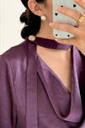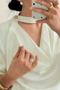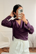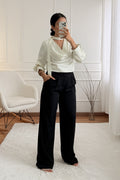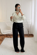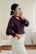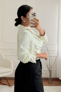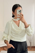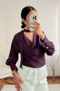 Esta blusa é uma peça distinta que alia elegância e conforto. Apresenta gola drapeada fluida que cria um efeito suave e sofisticado, acompanhada de uma tira com botão decorativo na gola para um toque contemporâneo. As mangas compridas incluem detalhe franzido com botão, acrescentando charme e personalidade ao design