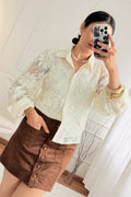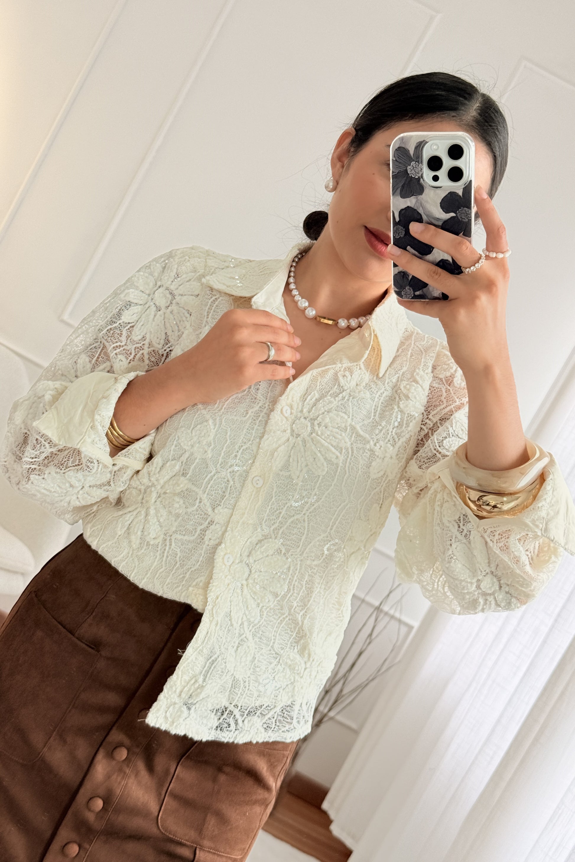 Blusa em renda translúcida com padrão floral, gola clássica e fecho de botões frontais. Mangas compridas com leve volume, acrescentando um toque elegante e sofisticado.