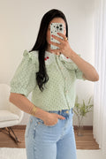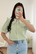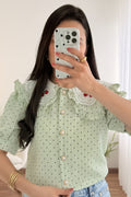 Blusa leve e romântica, com pontos delicados e gola dupla, ideal para um visual campestre e cheio de charme.