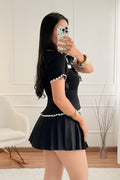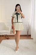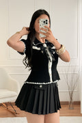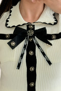 Inspirada no icónico estilo Chanel, esta blusa combina elegância clássica com um toque contemporâneo. Confeccionada em malha canelada estruturada, apresenta gola refinada com acabamento ondulado, botões decorativos com brilho e um laço frontal que reforça a estética feminina e sofisticada da peça.