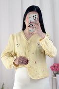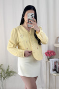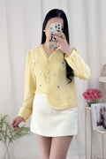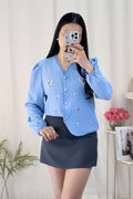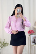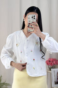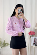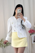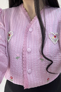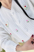 A blusa tem bordados de flores e um padrão de corações interligados por pérolas, com um estilo doce e campestre, repleto de energia primaveril.