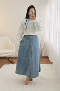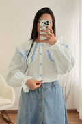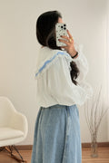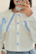 Blusa com gola ampla, fita azul e detalhes em renda. Botões com laço azul para um toque leve e fresco.