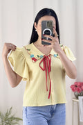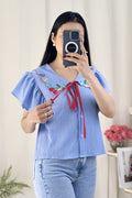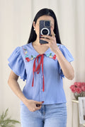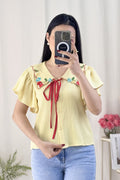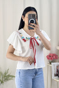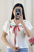 Uma blusa delicada com mangas suaves e uma gola encantadora com flores bordadas e um laço que dá aquele toque especial ✨