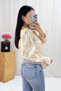 Blusa com padrão floral delicado, perfeita para dar um toque de frescor ao seu guarda-roupa. A manga com elástico e acabamento de rendinha traz um charme especial, proporcionando um ajuste confortável e elegante. Uma peça versátil e cheia de estilo, ideal para diversas ocasiões!