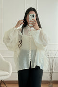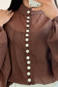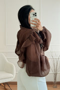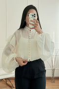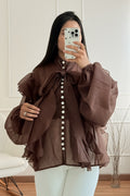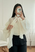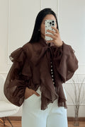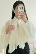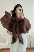 Uma blusa romântica e cheia de charme, folhos, botões com brilho e laço ao pescoço que dá um toque super especial!