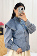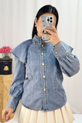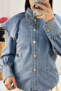 Camisa de ganga com gola alta e um toque feminino, destacando-se pelas duas peças de babados nos ombros que conferem um charme extra. O fecho frontal é adornado com uma fila de botões metálicos de diferentes formas,
