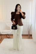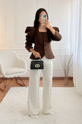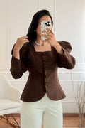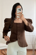 Descubra a elegância atemporal com esta blusa de alfaiataria sofisticada. Com design estruturado, destaca-se pelo decote quadrado e as mangas bufantes que trazem um toque vintage contemporâneo. O fechamento frontal com botões forrados reforça o estilo clássico e refinado. Ideal para compor looks elegantes para o trabalho, eventos sociais ou ocasiões especiais. Combine com calças de cintura alta para um visual equilibrado e elegante.