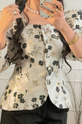 Blusa de corte estruturado com decote quadrado e fecho frontal de botões. As mangas volumosas destacam-se pelo design elegante, enquanto o tecido com padrão floral em relevo acrescenta sofisticação ao visual.