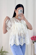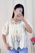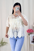 Blusa de renda com fechamento frontal em amarração. A parte inferior tem uma barra assimétrica com detalhes em rendinha.