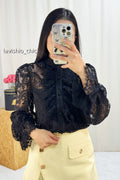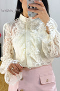 Blusa de renda com babados no estilo vintage francês, combinando delicadeza e charme em um design clássico e elegante.