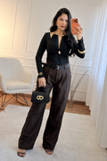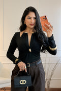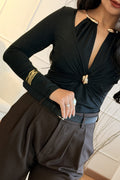 Elegante e sofisticado, este body apresenta um decote drapeado com aplicação metálica nos ombros, realçando a feminilidade e o toque refinado. O tecido elástico ajusta-se ao corpo, proporcionando conforto e valorizando a silhueta.
