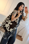 Adoramos esta bolsa da Lumina — feita em tecido tipo fazenda, com franjas giras e um padrão de vaca superoriginal. Dá logo um toque divertido e diferente a qualquer look. Perfeita para o dia-a-dia ou para dar aquele twist especial ao teu outfit!