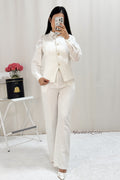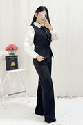 O colete, com seu corte impecável, é uma peça estilosa e prática, enquanto a calça de cintura alta traz um toque clássico e moderno ao look. Ideal para eventos formais ou para compor um visual elegante no dia a dia.