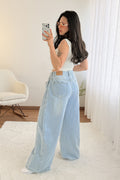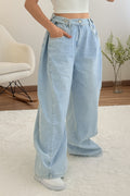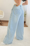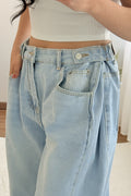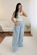 Calça ganga de cintura baixa com perna larga, com três botões de ajuste de cada lado da cintura para ajustar o tamanho.