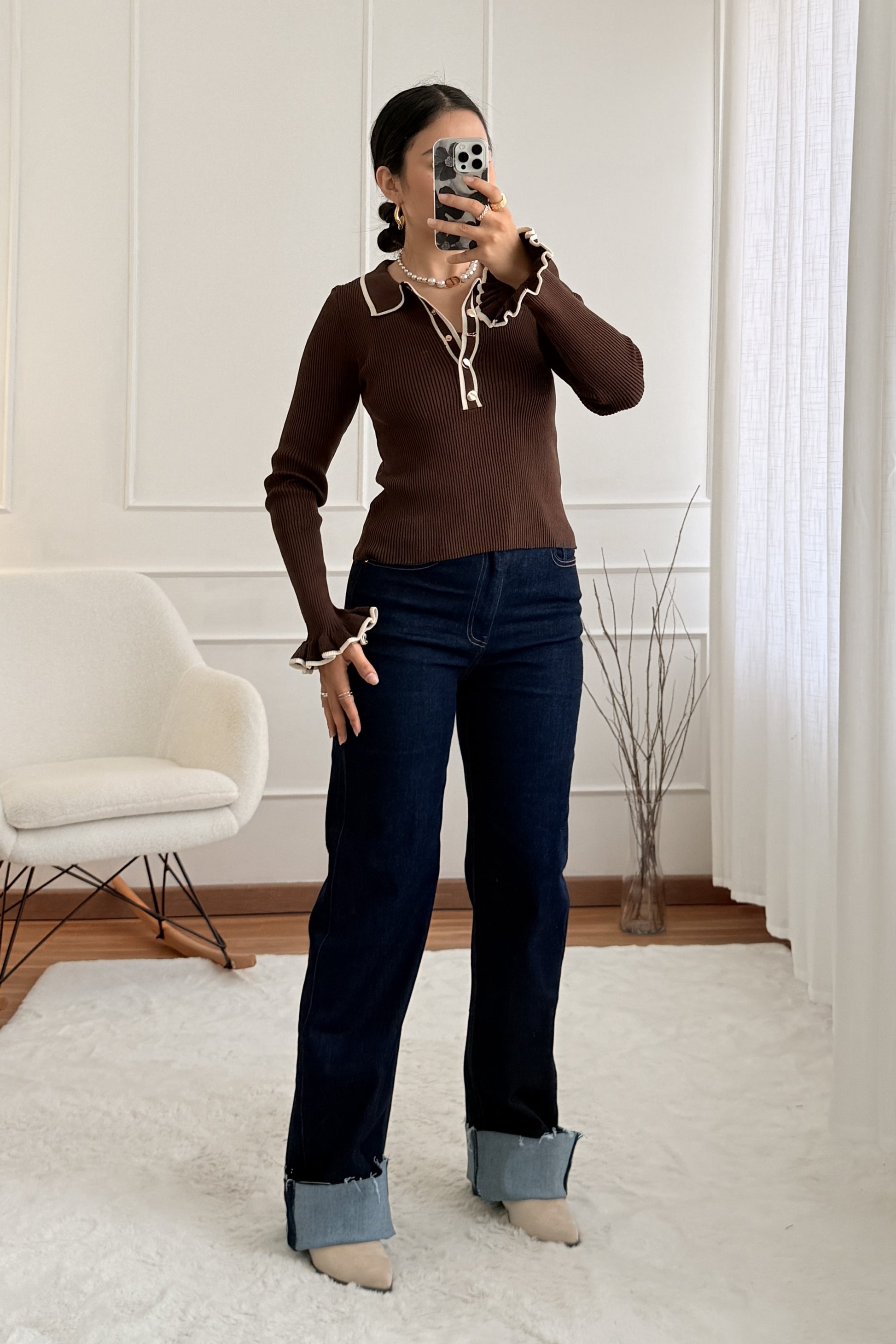 A modelo apresenta a peça com a barra dobrada (não faz parte do design original)