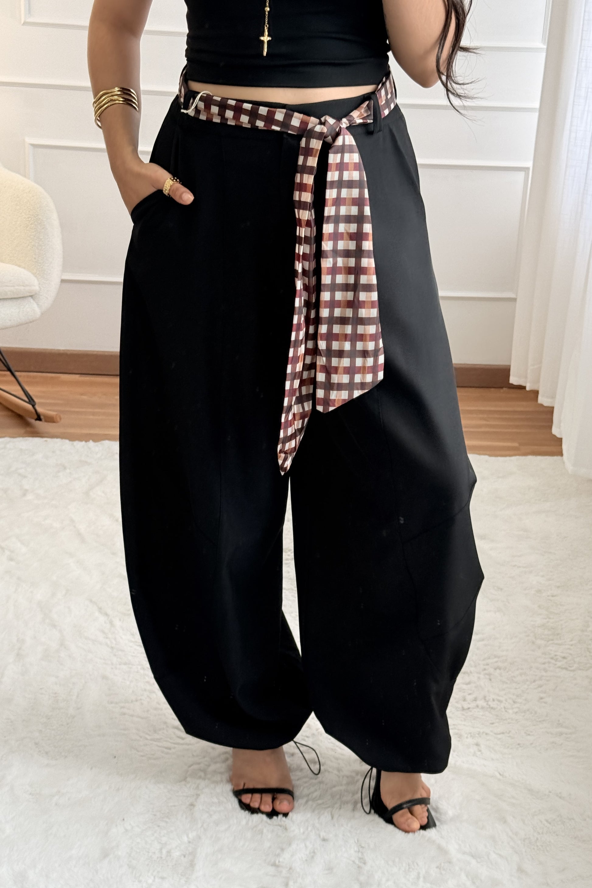 Calças de corte amplo, acompanhadas de cinto em lenço xadrez removível. Cós com elástico traseiro, ajusta-se de 36 cm até 40 cm. Bolsos laterais funcionais.