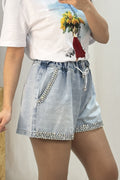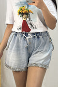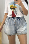 Calção com design de elástico na cintura, e borda com cristais ao redor da barra e dos bolsos.