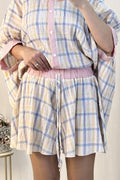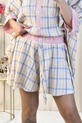Calção casual com riscas de cores diferentes e cós elástico com cordão ajustável.