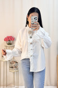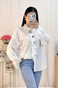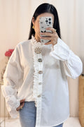 A camisa apresenta botões em forma de diamante, com diferentes designs delicados, e é adornada com um elegante alfinete de diamante. A gola, a parte frontal e os punhos têm um acabamento com babados, conferindo um toque de feminilidade e sofisticação à peça.
