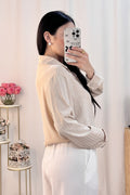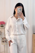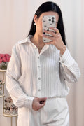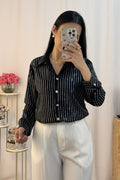 Camisa com riscas verticais formadas por strass, que brilham, com botões no fecho em forma de flores de diamante.