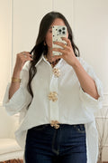 Esta camisa apresenta um design sofisticado e intemporal, com detalhe exclusivo nos botões. Botões em formato de flor dourada com aplicações brilhantes acrescentam
