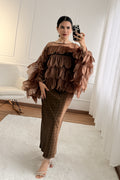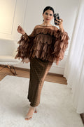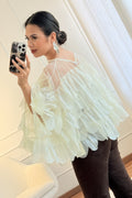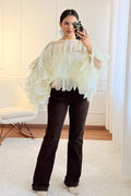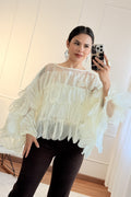 Camisa elegante e fluida, em camadas com leve transparência. Manga morcego para um caimento solto e confortável, ideal para looks sofisticados e modernos.