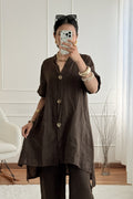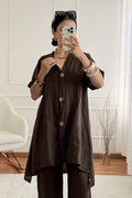 Botões frontais em destaque, mangas dobradas e bainha assimétrica para um visual descontraído e cheio de estilo.