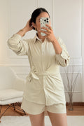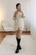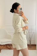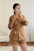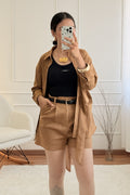 Camisa em camurça com corte descontraído e design moderno. Apresenta gola clássica, fecho frontal com botões e cinto na cintura para um ajuste personalizado. As mangas compridas podem ser usadas soltas ou arregaçadas