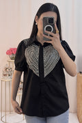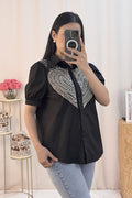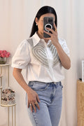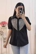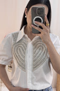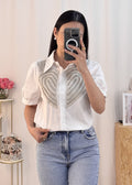 Camisa de manga curta com um padrão de coração adornado com strass na parte da frente.