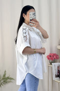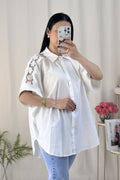 Camisa de manga curta e solta, com detalhes em renda nos ombros.