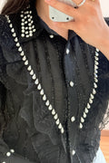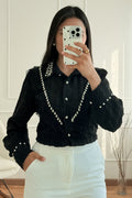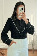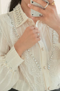 Camisa sofisticada com detalhes ricos e femininos, ideal para elevar qualquer look. O modelo apresenta aplicação de renda delicada na frente e mangas, gola com acabamento refinado e botões com efeito pérola. O toque final de brilho fica por conta dos cristais aplicados ao longo da gola e da parte frontal.