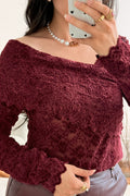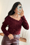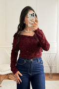 Camisola feminina em renda delicada, com decote largo que valoriza o colo e alonga a silhueta. As mangas compridas acrescentam um toque de elegância, enquanto o corte ajustado realça as curvas de forma subtil
