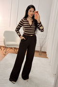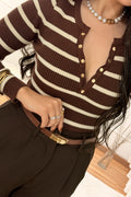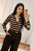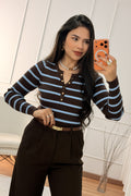 Características: malha elástica / padrão às riscas / botões dourados / decote em V