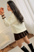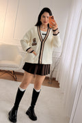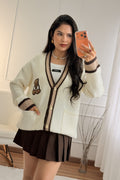 Cardigan em malha macia e confortável, com bordas contrastantes em castanho e bege.