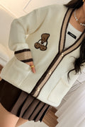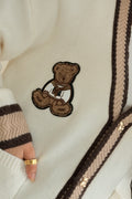 Detalhe fofo de ursinho bordado no peito e botões decorativos dourados, dando um toque delicado e moderno.