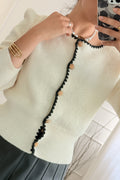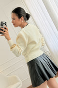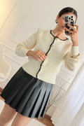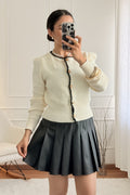 Cardigan em malha macia, estilo Chanel, com botões decorativos e detalhe contrastante no abotoamento. Corte elegante e versátil,