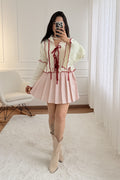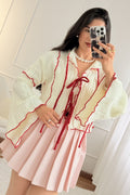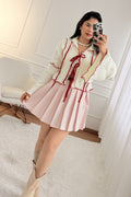 Cardigan em tricot com detalhes em relevo e acabamento contrastante, fechamento com laços frontais que dão um toque delicado e moderno. Modelagem ampla e confortável.